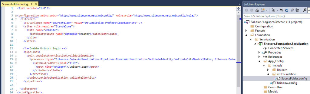 Create a “SourceFolder.config” file under zzz.Foundation folder and copy paste below configuration – update the source folder path as per your requirement. (can be root of your solution i.e “src” folder path). Unicorn will serialize Sitecore items as .yml files in this folder path.