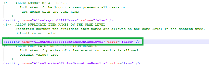 I thought of finding the setting and allowing it create the duplicate items at same level. The setting name “AllowDuplicateItemNamesOnSameLevel” in Sitecore.config file under App_Config folder. Default it is set to false to restrict the duplication.