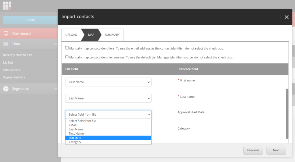 4. Now you will be presented a screen with different dropdowns to map the fields (Ex. Email with Email, Category with Category, etc.)