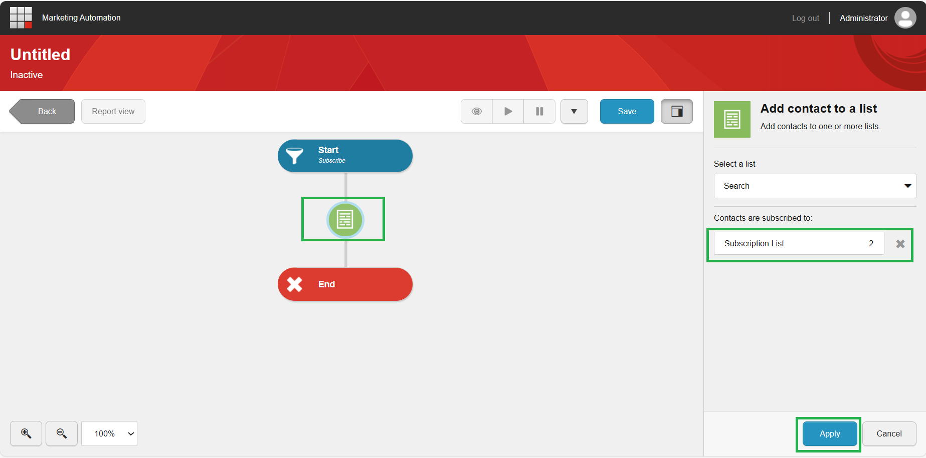 - Add an action between Start and End, Add Contact to a list.