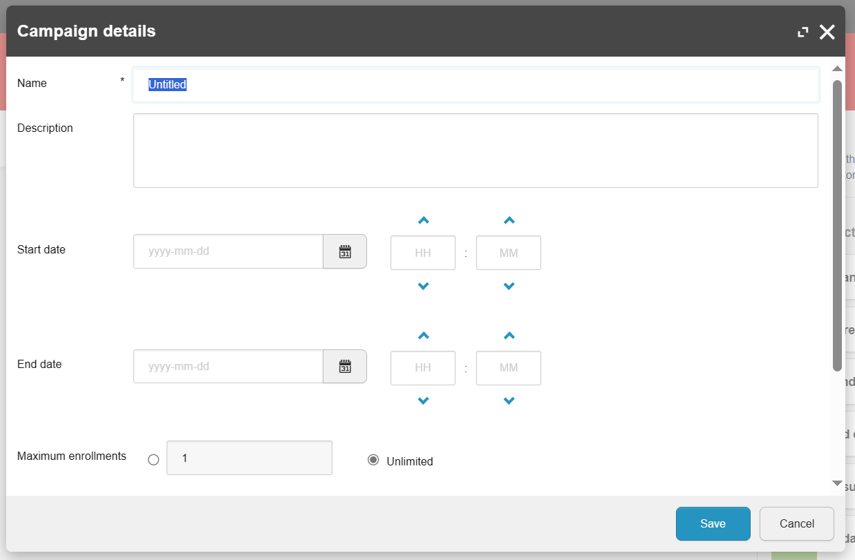 - Click on Save and you will receive a pop-up where you will need to specify the name of MA, Start Date, End date, Enrolling the user # of times.