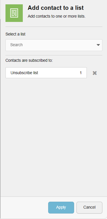- Select the Unsubscribe List inside the Add Contact to a list action.